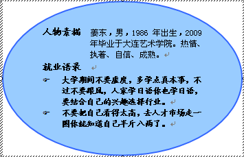 职业生涯规划是国际商务学院比较重视的问题,新生入学后都要参加职业生涯规划方面的教育。在教师的就业指导下,学生们早早就有了职业发展意识。姜东的身上有着一般学生中少有的执着和自信,他并不满足于校企合作协议下给大多数学生设计的前厅、餐厅等就业岗位,一直在寻觅点燃心中梦想又能融入兴趣、符合自身特质的机遇。姜东是幸运的,命运总要垂青执着的人。大三上学期一次偶然的机会,姜东在酒吧里结识了一位调酒师,“看到调酒师扔瓶子很帅,就决心学调酒了。”说到这,姜东狡黠地笑了,“其实我学调酒还有一个原因,就是不想去酒店端盘子”。于是,姜东报名参加了一个调酒培训班,专门学习英式调酒。经过半年多的学习,姜东基本掌握了酒类的调制要领。此时已是大三下学期,姜东去了银帆宾馆的大堂吧,边工作边学习,在调酒的基础上,又逐渐掌握了咖啡、果汁等软饮的调配方法。半年实习期满后,姜东的调酒技术已经达到了一定程度,此时他已经不再满足于做一名调酒师,他需要更多的酒店管理实践经验。于是,大四上学期,他来到瓦房店某房地产企业旗下的高级会所,担任酒水主管一职,他出色的工作表现得到了酒店高层的认可,两个多月后,他被任命为餐饮部经理,负责整个餐饮部的管理工作。而此时,他还只是一名没毕业的学生。