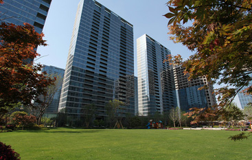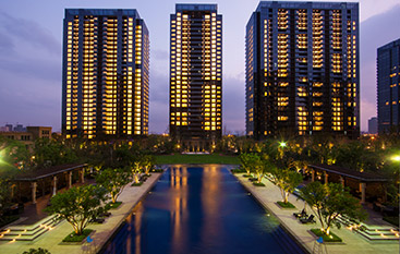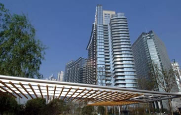 玻璃幕墙高层公寓系列往往与酒店、商场等公建一起形成城市优越地块的建筑群。规划布局及景观规划与简洁精致的外立面相呼应,规划布局工整对称,景观规划以偏现代的构图、线形为宜。在规划中强调园区的私密性,强调业主日常使用中的便利性和人性化。